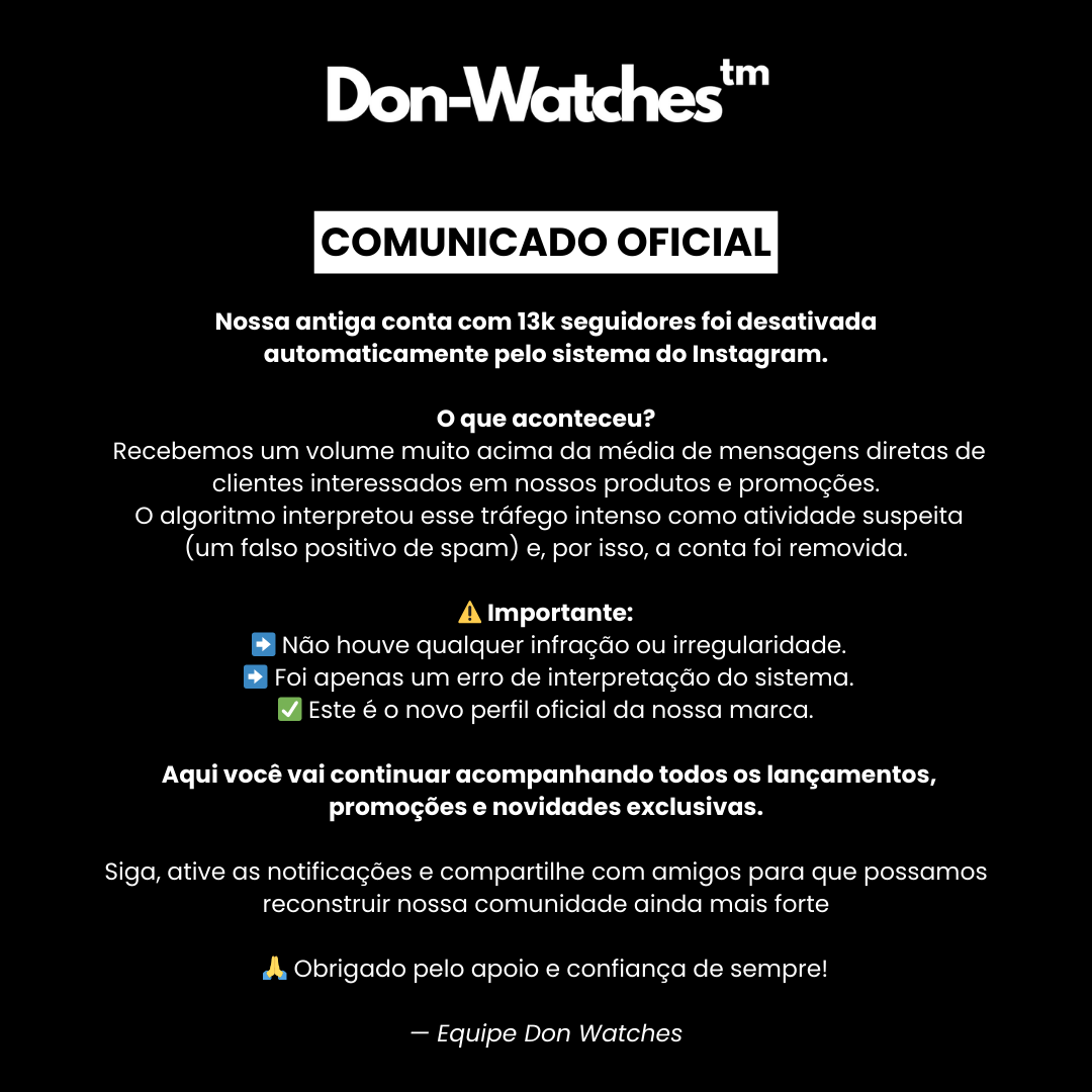Cada relógio é embalado, registrado e despachado com segurança, e caso ocorra qualquer imprevisto, a Don-Watches assume total responsabilidade até o produto chegar em você.